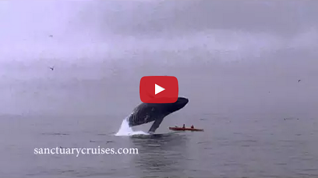 While on a whale watching cruise off the coast of Monterey, California, Larry Plants filmed this crazy video of an almost full-size humpback whale breach right next to two kayakers in a tandem kayak. Thankfully, the huge whale didn’t make direct impact with the kayakers, but he still managed to knock them into the ocean.