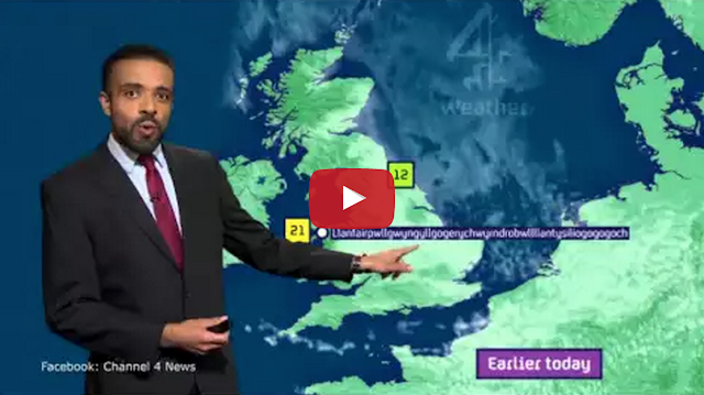 Channel 4 News weather presenter Liam Dutton smoothly pronounces the longest town name in Wales, Llanfairpwllgwyngyllgogerychwyrndrobwllllantysiliogogogoch, while delivering the evening weather report.