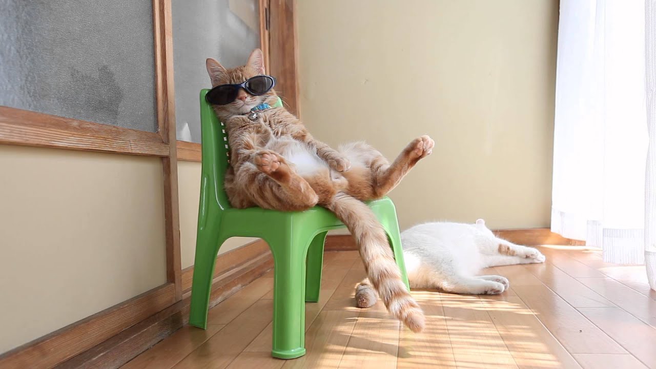 Tyatora, the ginger tabby cat from Japan, spends a lazy Saturday afternoon chilling in his favorite chair with cool shades on.