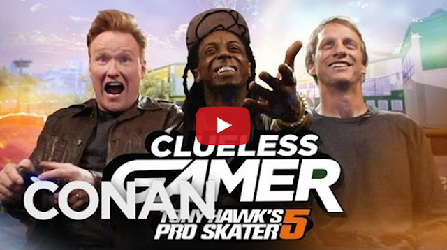 In this episode of Conan O’Brien’s “Clueless Gamer” series, Conan plays the upcoming 2015 skateboarding video game Tony Hawk’s Pro Skater 5 with rapper Lil Wayne and pro skater Tony Hawk himself.