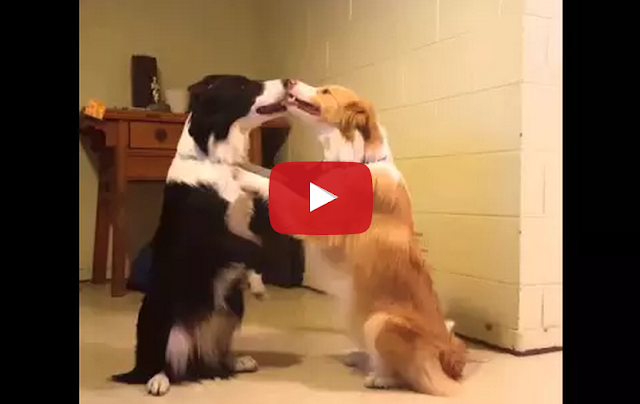 Two super smart border collies, Ace (black and white) and Holly (red and white), perform their adorable hug and kiss trick.