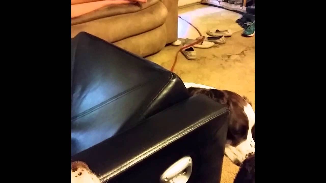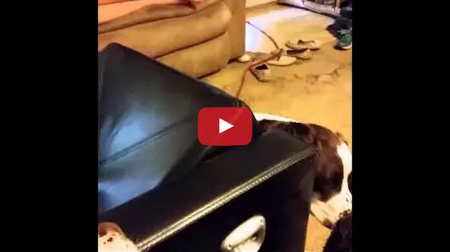 Honor, the English springer spaniel dog, found the perfect spot to get away from it all (at least when his human’s stop calling his name) in the inside of a reclining leather chair.
