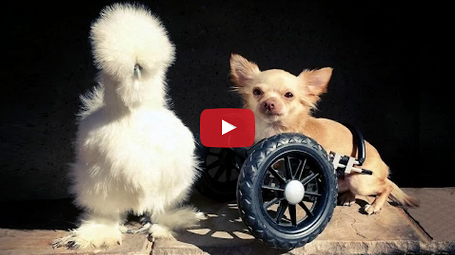 Roo, the handicapped but energetic chihuahua, and Penny, the fluffy silkie chicken, became instant, unusual best friends with they were rescued and re-homed together.