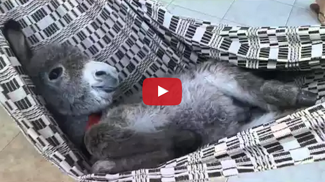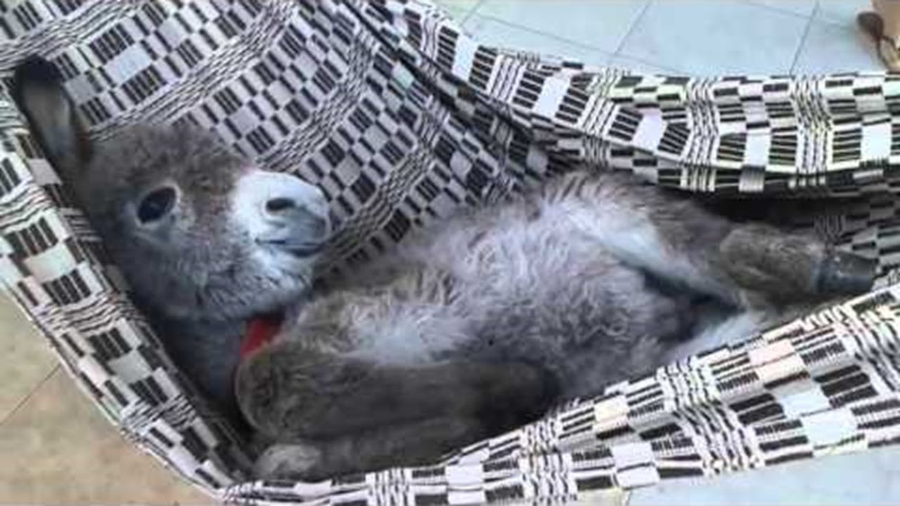 Leo, a fluffy baby donkey from Gôiania, Brasil, appears to have a smile on his face while he gently swings in a hammock.