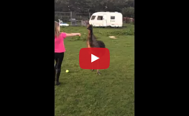 This playful emu has a blast playing fetch with her human, but instead of picking the ball up like a dog, she prefers to do a little dance around it instead.