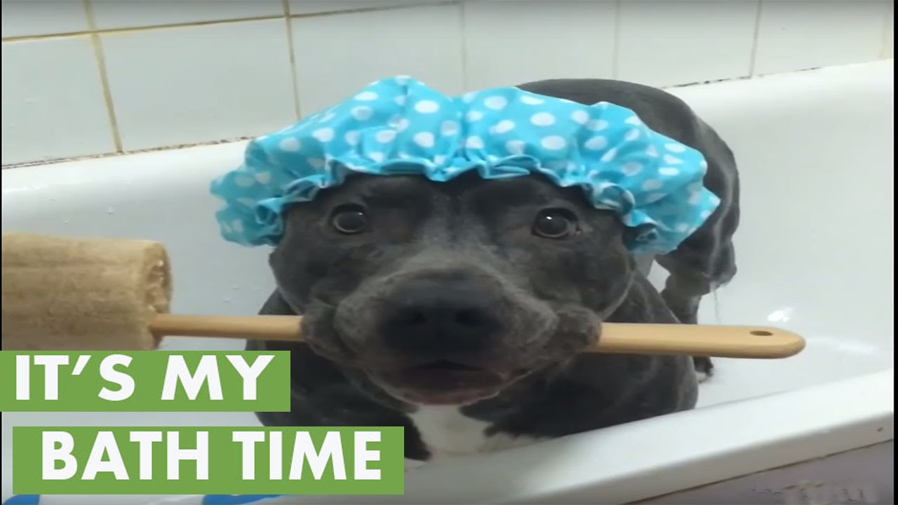 Unlike most dogs, Ramsey, the pit bull, loves taking showers in the tub, and he even comes prepared with all the essential bathing gear.