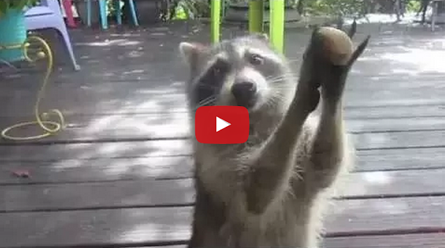 This persistent mother raccoon, who’s been given the appropriate name Rocksy, uses a small rock to “knock” on a sliding glass door whenever she wants more cat food.
