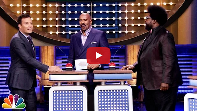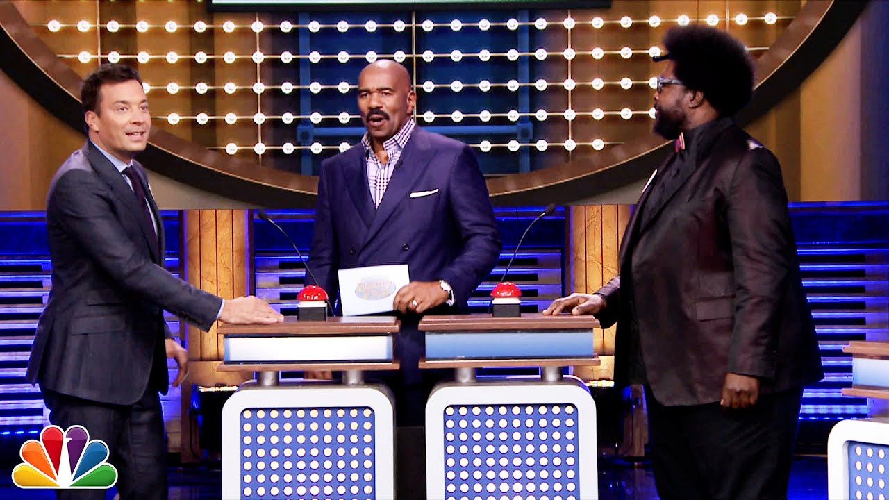 Steve Harvey hosts a Tonight Show edition of the game show Family Feud where Tonight Show host Jimmy Fallon, actress Alison Brie, and Tonight Show announcer Steve Higgins face off against members the band The Roots, Questlove, Tarik, and James Poyser.