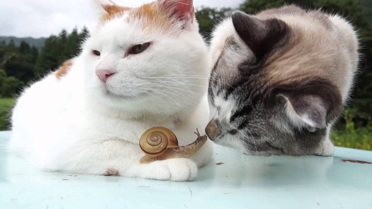 Two Cats Make Friends with a Snail