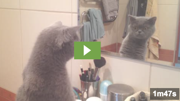 Caesar, the cat, makes some pretty comical facial expressions while checking himself out in the mirror for the first time.