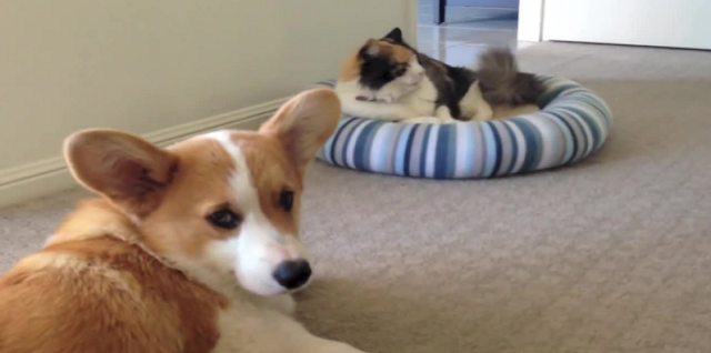 Basil, the 4-month-old corgi puppy, desperately wants to make friends and play with his standoffish feline housemate, Pudda.