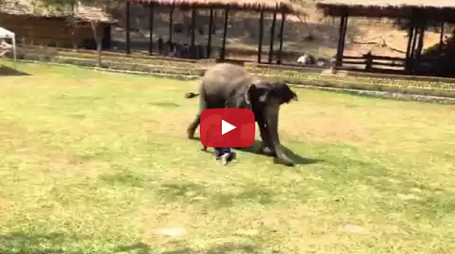 Thongsri, a sweet 17-year-old elephant from Chiang Mai, Thailand, quickly comes to the aid of her caretaker when a man pretends to attack him.