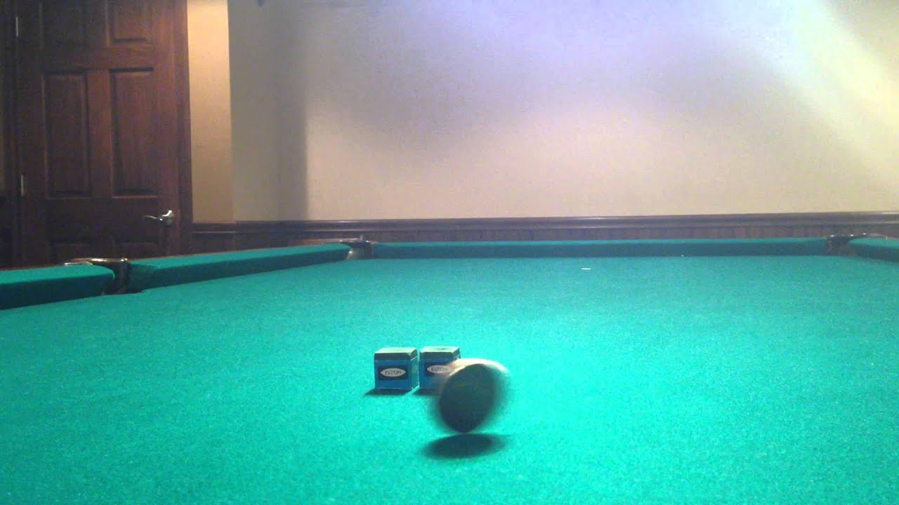 In this short video, a man, from Hinckley, Ohio, performs an unbelievable billiards trick shot using a quarter and two chalk cubes.