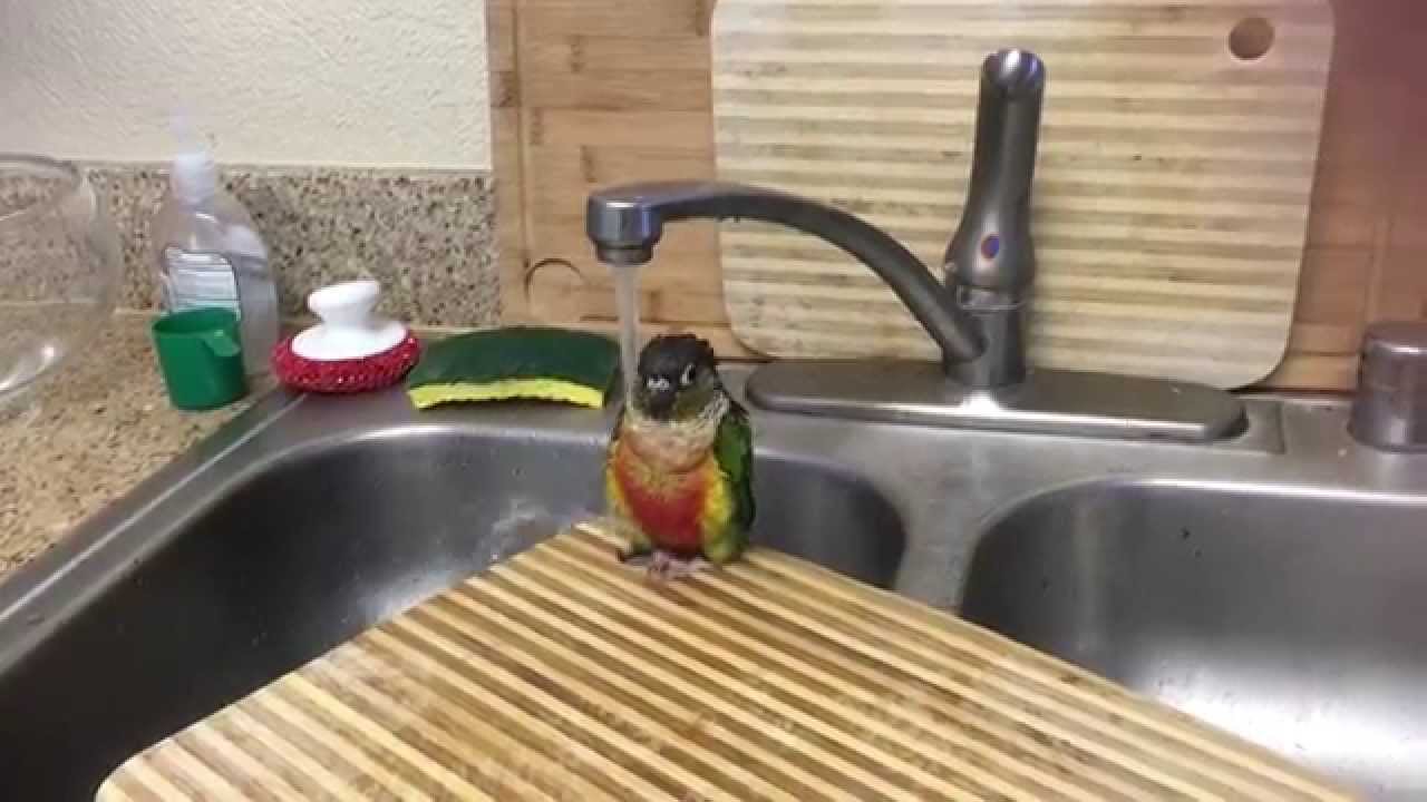 A cutting board cleverly positioned under a kitchen sink faucet makes a perfect miniature shower for Charlie, the green-cheeked parakeet.