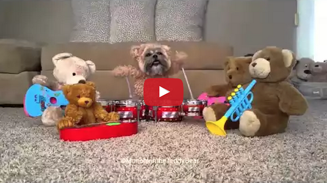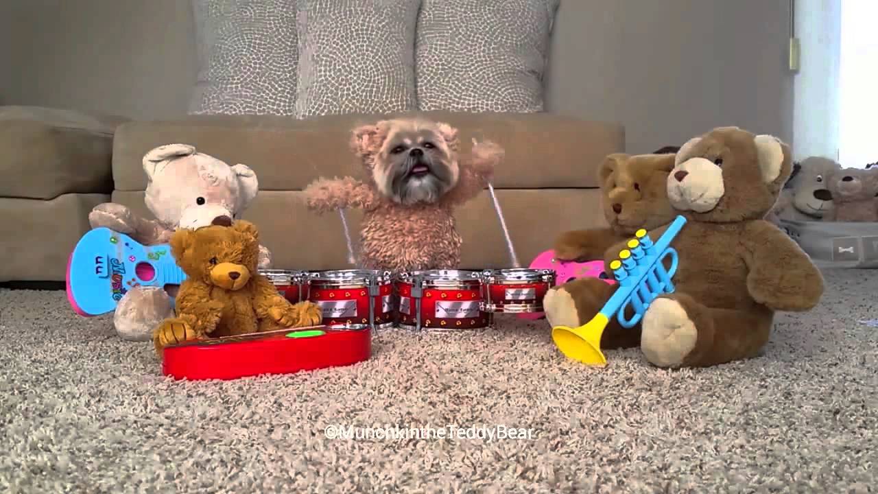 Munchkin the famous teddy bear (shih tzu in a homemade teddy bear costume) plays an epic drum solo while performing with her new all-bear band.