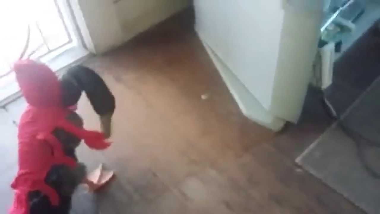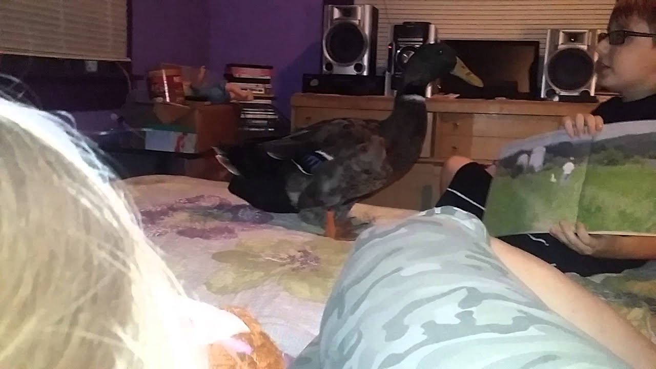 Nibbles, the pet mallard duck, adorably waddles after his favorite human, Jonny, while wearing his new lobster Halloween costume.