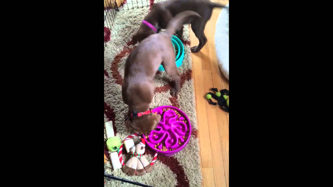 These cute puppies have developed the habit of walking in circles around their slow feeding food bowls whenever they eat.