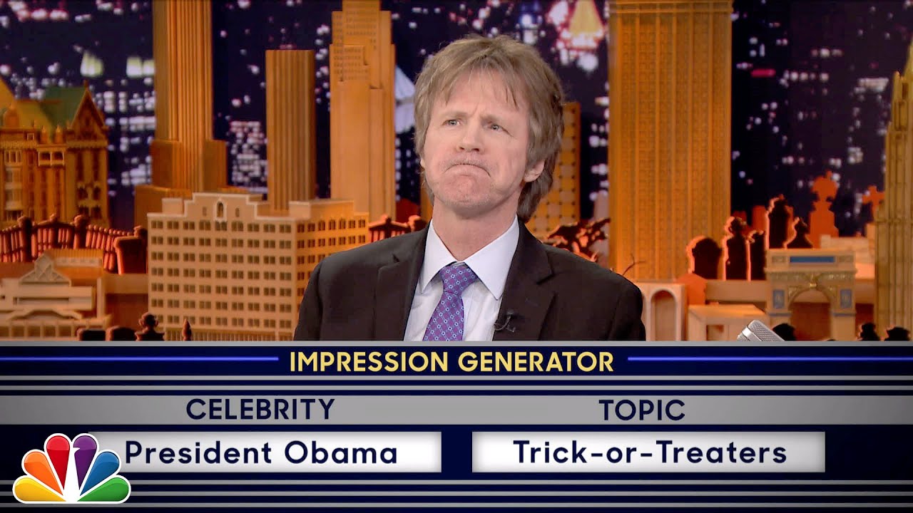 Tonight Show host Jimmy Fallon and actor/comedian Dana Carvey take turns performing randomly selected celebrity impressions while discussing Halloween-themed topics.
