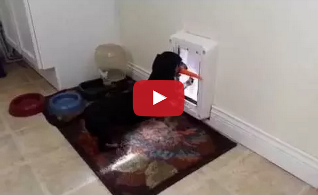 This determined dachshund dog wants to show his carrot the great outdoors, but he first has to figure out how to fit it through the doggy door.