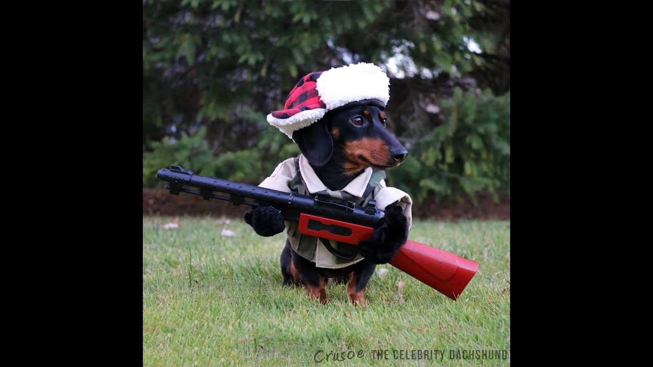 Crusoe the Celebrity Dachshund goes on a hunting adventure while dressed in an adorable Elmer Fudd-inspired outfit.