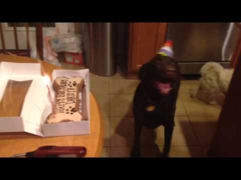 Dakota, the dog, can’t contain his happiness when his humans sing him the “Happy Birthday” song and surprise him with a big birthday cake.