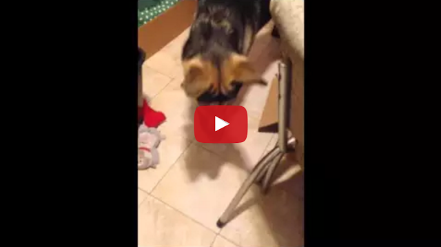 This determined German shepherd dog attempts to pounce attack his own shadow, after discovering it for the first time on the kitchen floor.