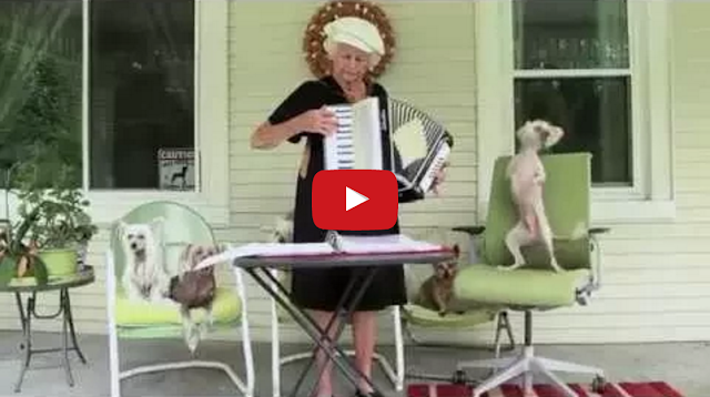 Nathan, the Chinese Crested-Hairless dog, dances along to a lady’s accordion rendition of the classic Coca-Cola jingle “I’d Like to Teach the World to Sing.”