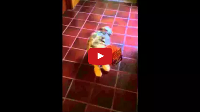 Olive, the dog, accidentally gets an empty tissue box stuck on her head, but she doesn’t let it affect her happy tail-wagging attitude.