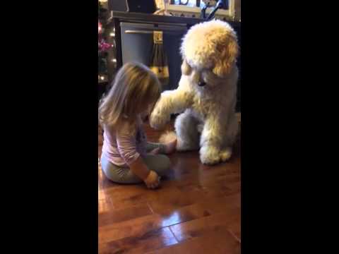 Little Girl Teaches Big Fluffy Dog How to Shake Paws ByTastefully Offensive November 19, 2015 In this cute video from PawMyGosh, three-year-old Haley teaches her older “brother” Gauge, the labradoodle, how to shake paws like a gentleman. [PawMyGosh]