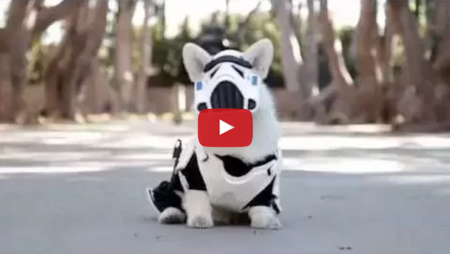 Winston, the white corgi dog, shows off his awesome, custom-made Star Wars Stormtrooper (aka Stormfloofer) Halloween costume.