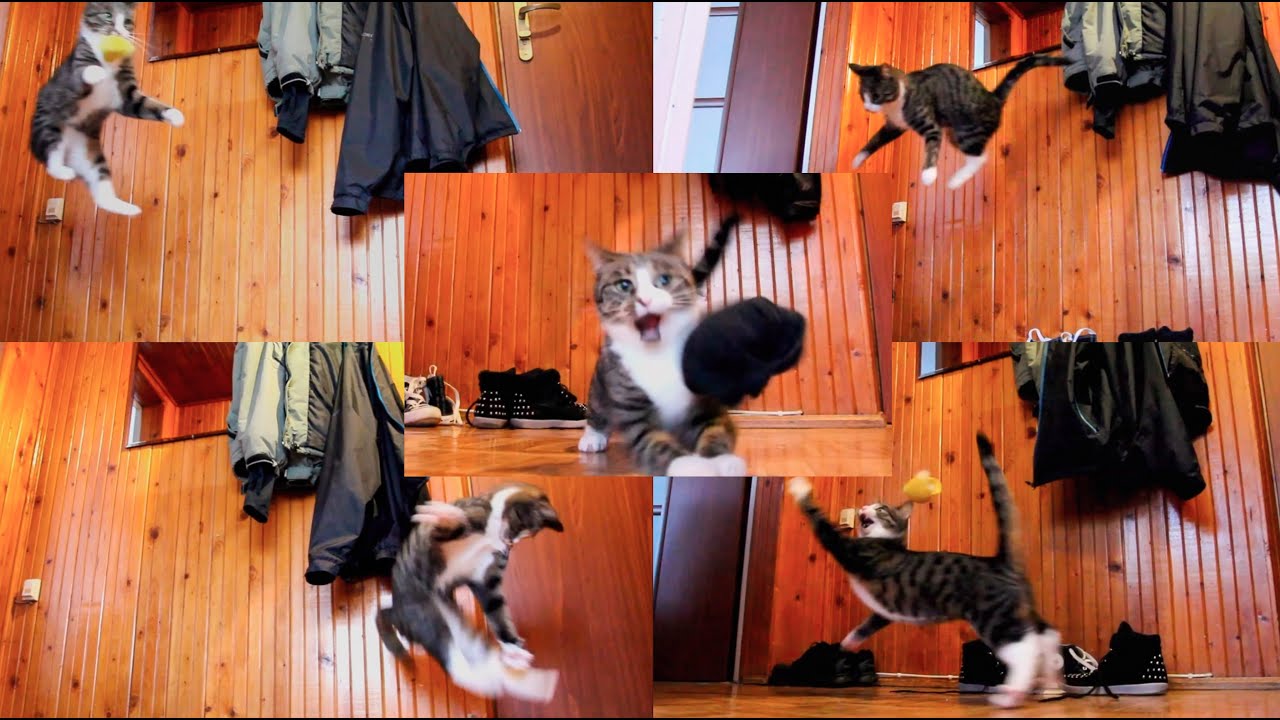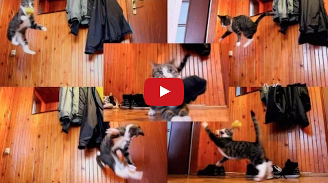Nikita the cat’s human put together this montage of her acting like a psycho kangaroo as she hops and jumps all around the house, and over her feline housemate, Bobo.