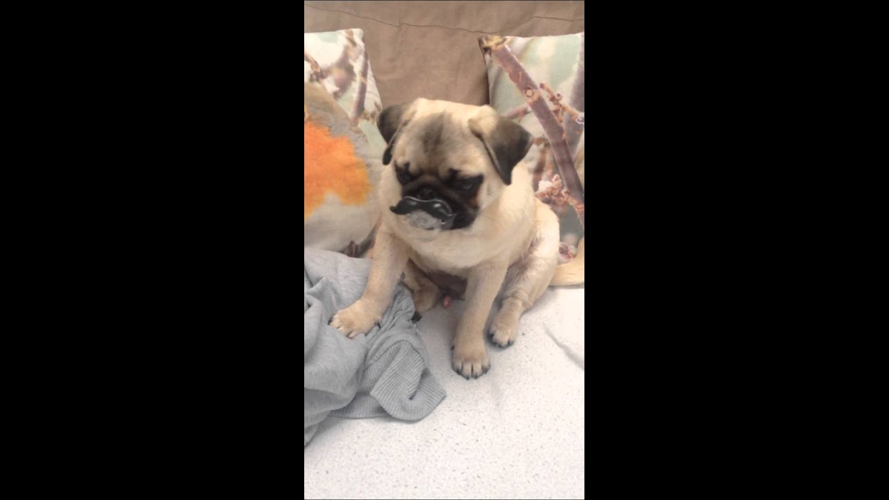 Pugsy the pug puppy was given a mustache-shaped baby pacifier to play with, and now the little puglet refuses to give it up.