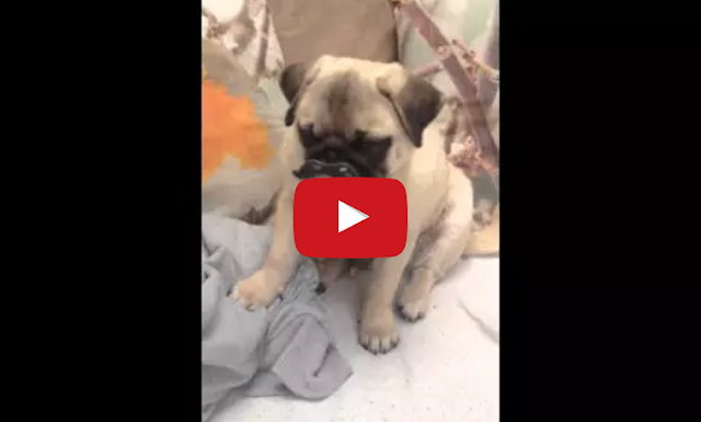 Pugsy the pug puppy was given a mustache-shaped baby pacifier to play with, and now the little puglet refuses to give it up.