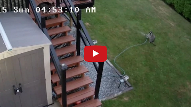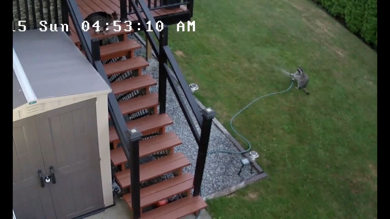 After getting kicked off a deck by a cat, this wild raccoon hilariously appears to get revenge by spraying water at the cat with a nearby sprinkler.