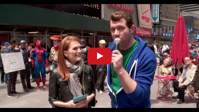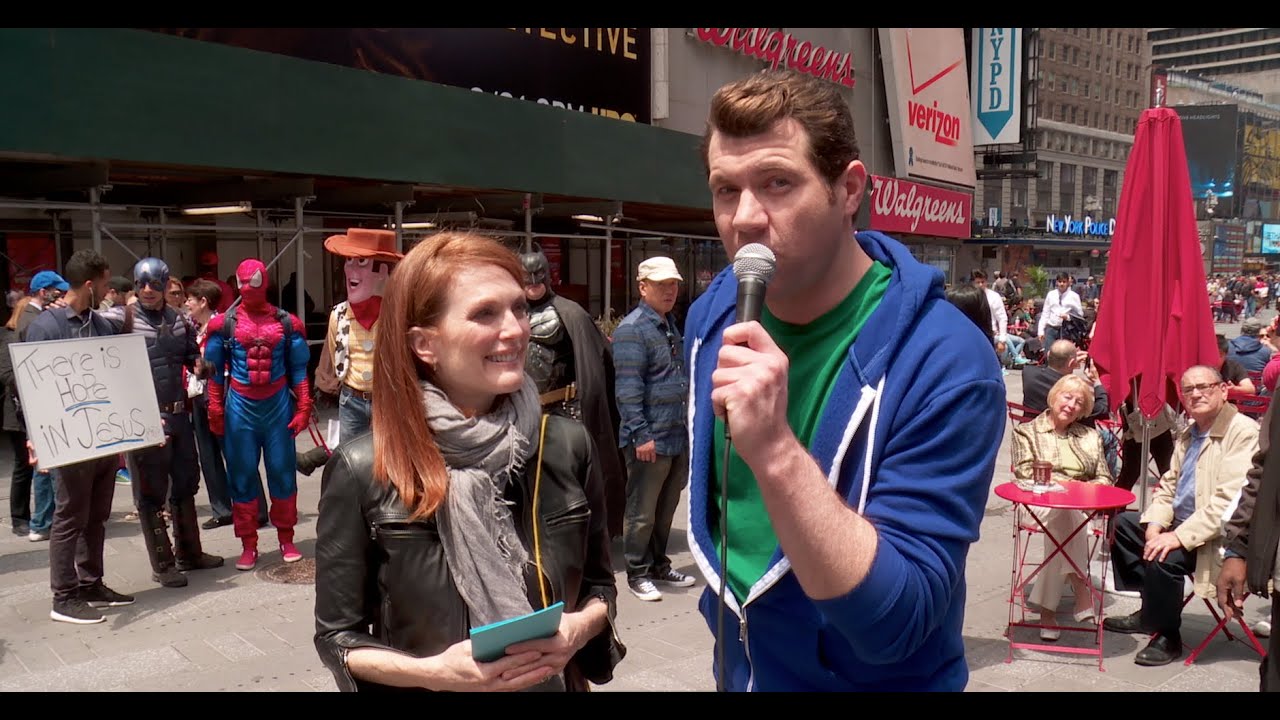 (PG-13 language) In this funny new clip from comedian Billy Eichner‘s truTV comedy series, Billy on the Street, Oscar-winning actress Julianne Moore earns tips from Times Square tourists by reenacting some of her iconic movie scenes.