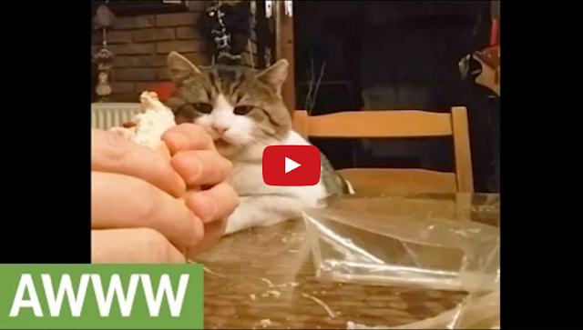 This cute cat joins his human at the dinner table in hopes of sharing his sandwich with him, but has to resort to some gentle clawing and begging to convince him to hand over a bite.