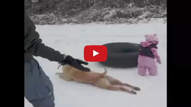 When this bundled up baby starts looking a little confused about how to slide on snow, a silly dog shows up to demonstrate how it’s done.