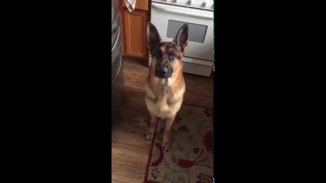 Despite having recently eaten, Apollo, the German shepherd, makes it clear to his human that he’s ready for a midday snack.