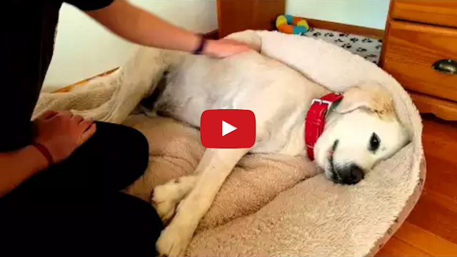 While relaxing in his bed, this spoiled golden retriever puppy insists on receiving an endless supply of belly rubs from his human.