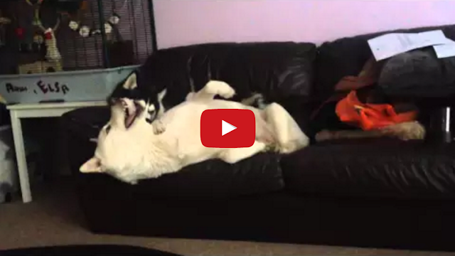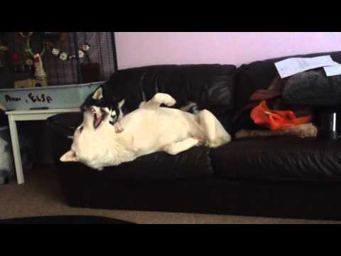 Xena, the Siberian husky, desperately tries to get her older sister, Kiko, to play with her while she’s trying to nap on the couch.