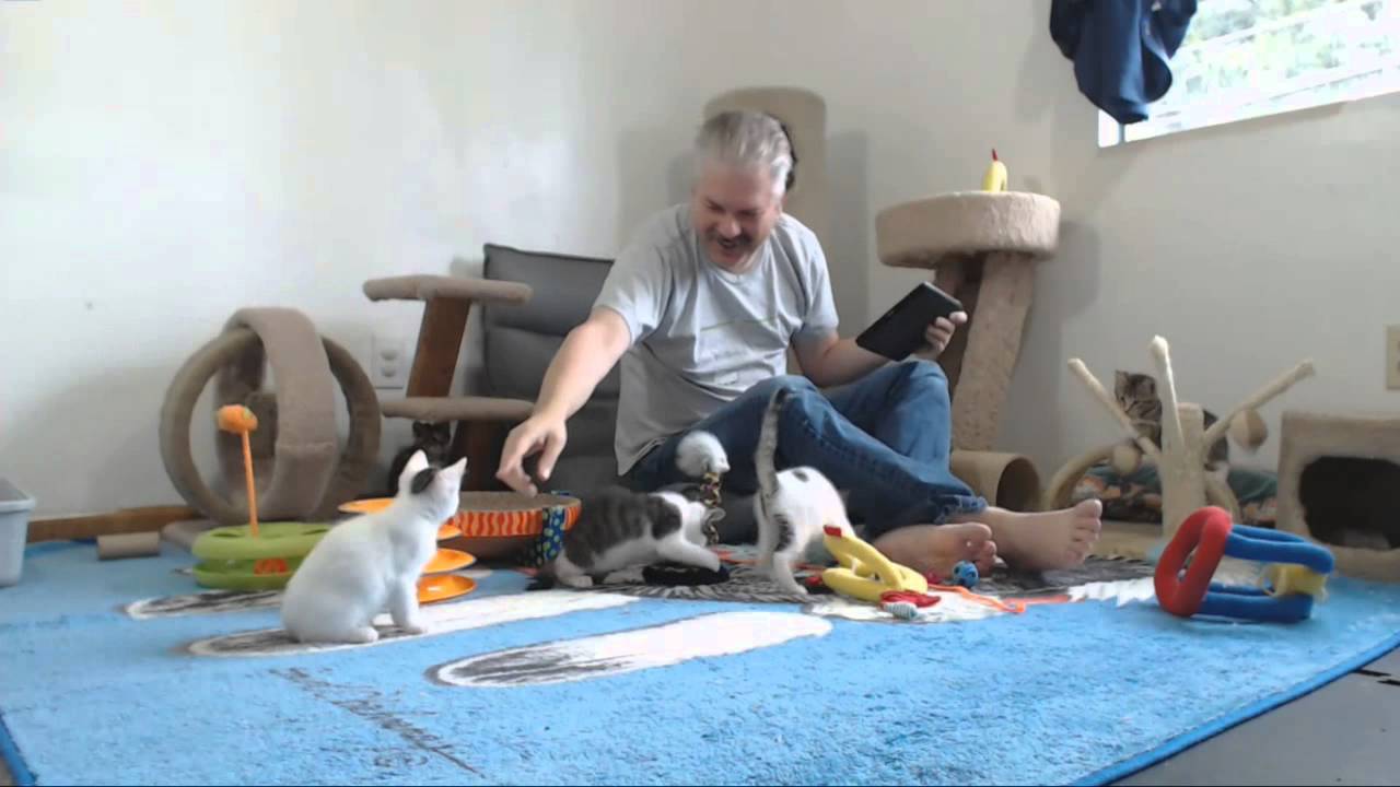 While distracted by his playing siblings, Lennier, the kitten, gets startled and does a flip that would make any ninja proud when his human reaches to pet him.