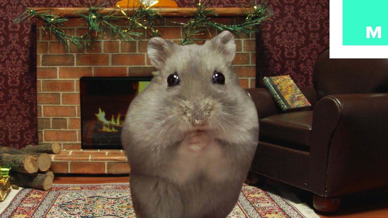 Starlight, one of the adoptable hamsters from Westchester Rescued Hamster Haven, curiously explores a cozy, miniature Christmas setting in this cute 12-minute holiday Yule log video.