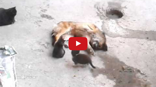 In this cute clip from Russia, a friendly dog takes a mother cat’s two rambunctious kittens off her hands paws while she takes a much needed break.