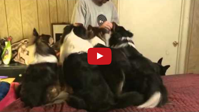 One of these shetland sheepdogs (aka shelties) has cleverly figured out a way to get a few bonus treats from his human.