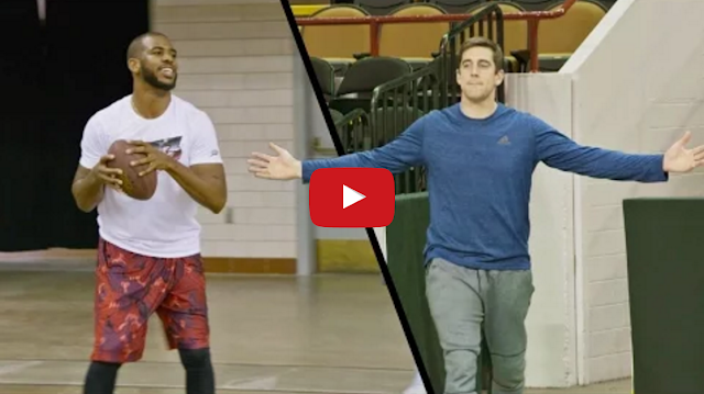 NBA point guard Chris Paul of the L.A. Clippers and NFL quarterback Aaron Rodgers of the Green Bay Packers perform a series of challenging basketball and football trick shots with Dallas, Texas-based trick shot team, Dude Perfect.