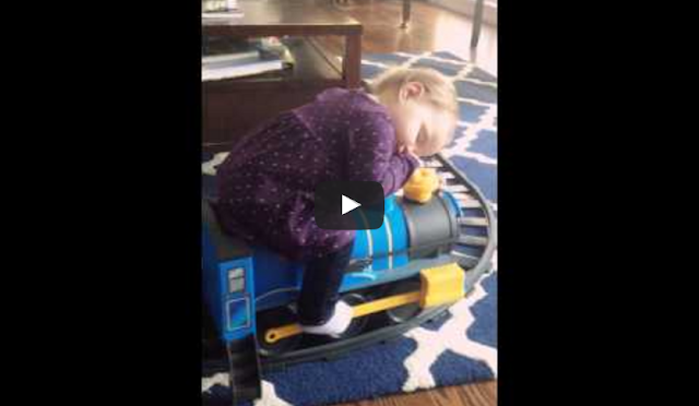 Baby Vivienne ran out of steam and fell asleep while playing on her older brother’s Imaginarium toy train. Vivienne’s dad, Andy Hoeing, explains what happened: “She knows how to mount and dismount the train, so I wasn’t worried when I went into the other room to respond to a work email. She became oddly quiet (you know, like when they’re being mischievous), so I quickly headed back to check on her. She had fallen fast asleep! Melted my heart.”