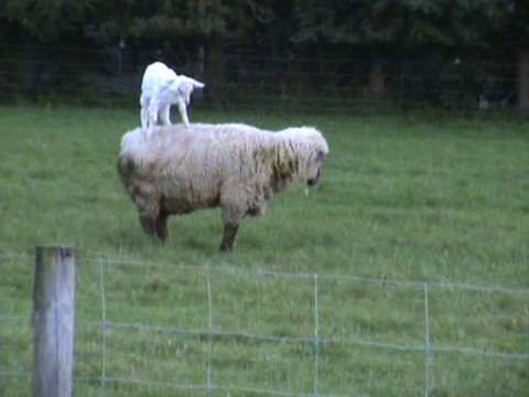 Feta, the baby saanen goat, jumping and climbing all over Ramtastic, the dorset down ram, who doesn’t seem to mind all that much.