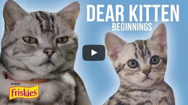 A wise older cat (voiced by Ze Frank) shares his kittenhood memories and experiences with his new kitten housemate, in the latest edition of the “Dear Kitten” ad series for Friskies cat food.