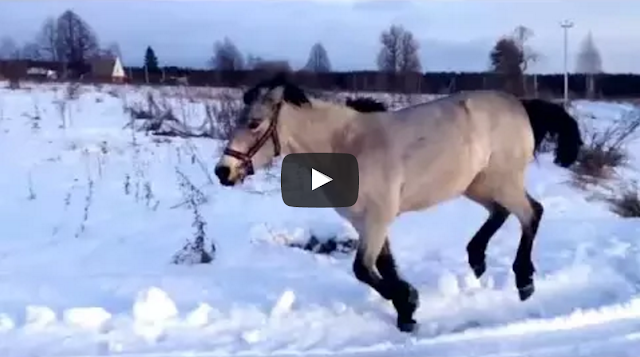 Unlikely best friends, Rita, the horse, and Balu, the akita dog, have fun taking turns chasing each other around their human’s snow-covered farm in Russia.