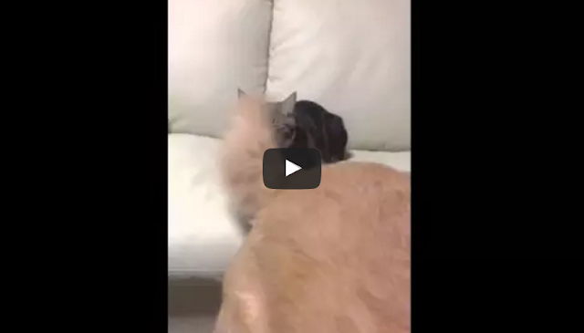 Asia, the cat, gets a face full of fluff when her clumsy canine housemate, Ponzu, the golden retriever, unknowingly tail whips her face.